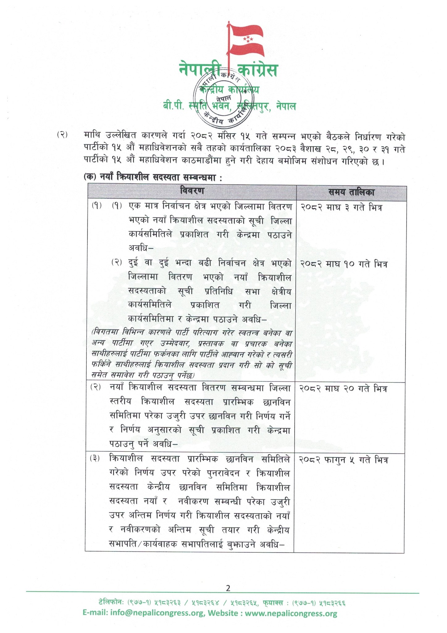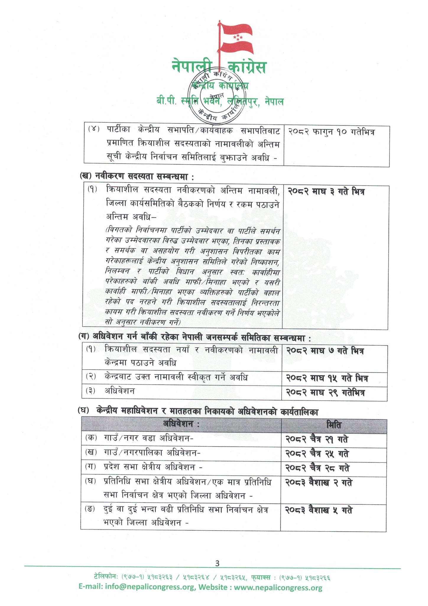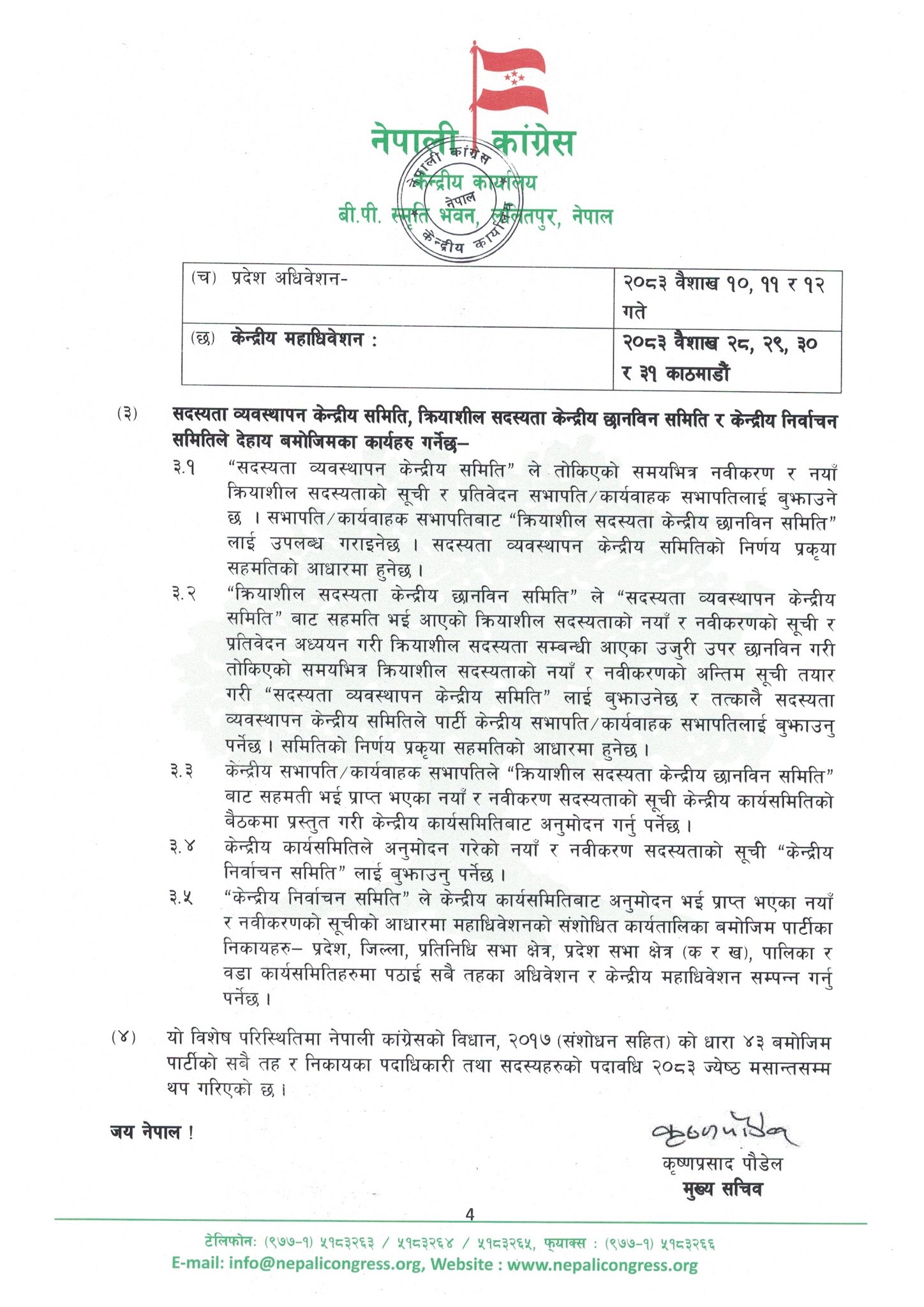 पार्टी मुख्य सचिव कृष्णप्रसाद पौडेलले जारी गरेको परिपत्रमा फागुन २१ गते हुने प्रतिनिधि सभा निर्वाचनलाई सफल बनाएर पार्टीलाई बहुमत ल्याउन सबै क्रियाशील हुन भनिएको छ । पुस १८ गतेको कार्यसम्पादन समितिको निर्णयअनुसार भनेर १९ गतेको मिति भएको परिपत्र कांग्रेसले आज आफ्नो फेसबुक पेजमार्फत सार्वजनिक गरेको हो ।