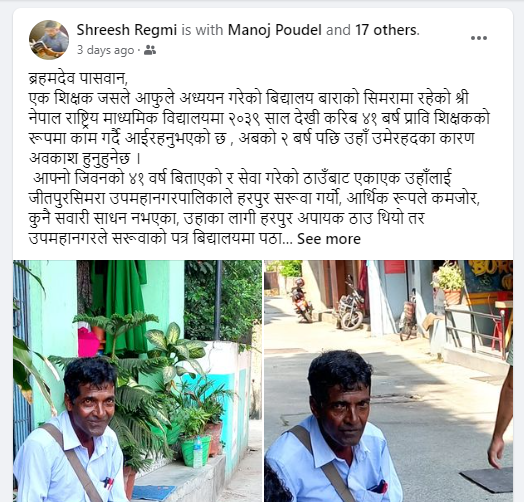 बारा, १६ असोज । गत शनिवार बिहानैदेखि सामाजिक संजाल फेसबकुमा शिक्षक ब्रम्हदेव पासवानको तस्वीर चर्चामा छ । सडक..