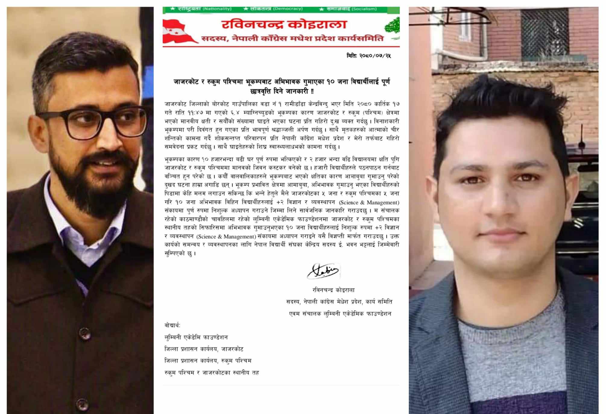 नेविसंघका नेता भट्टकाे पहलमा १० भूकम्प प्रभावित विद्यार्थी लुम्बिनी कलेजले निशुल्क पढाउने